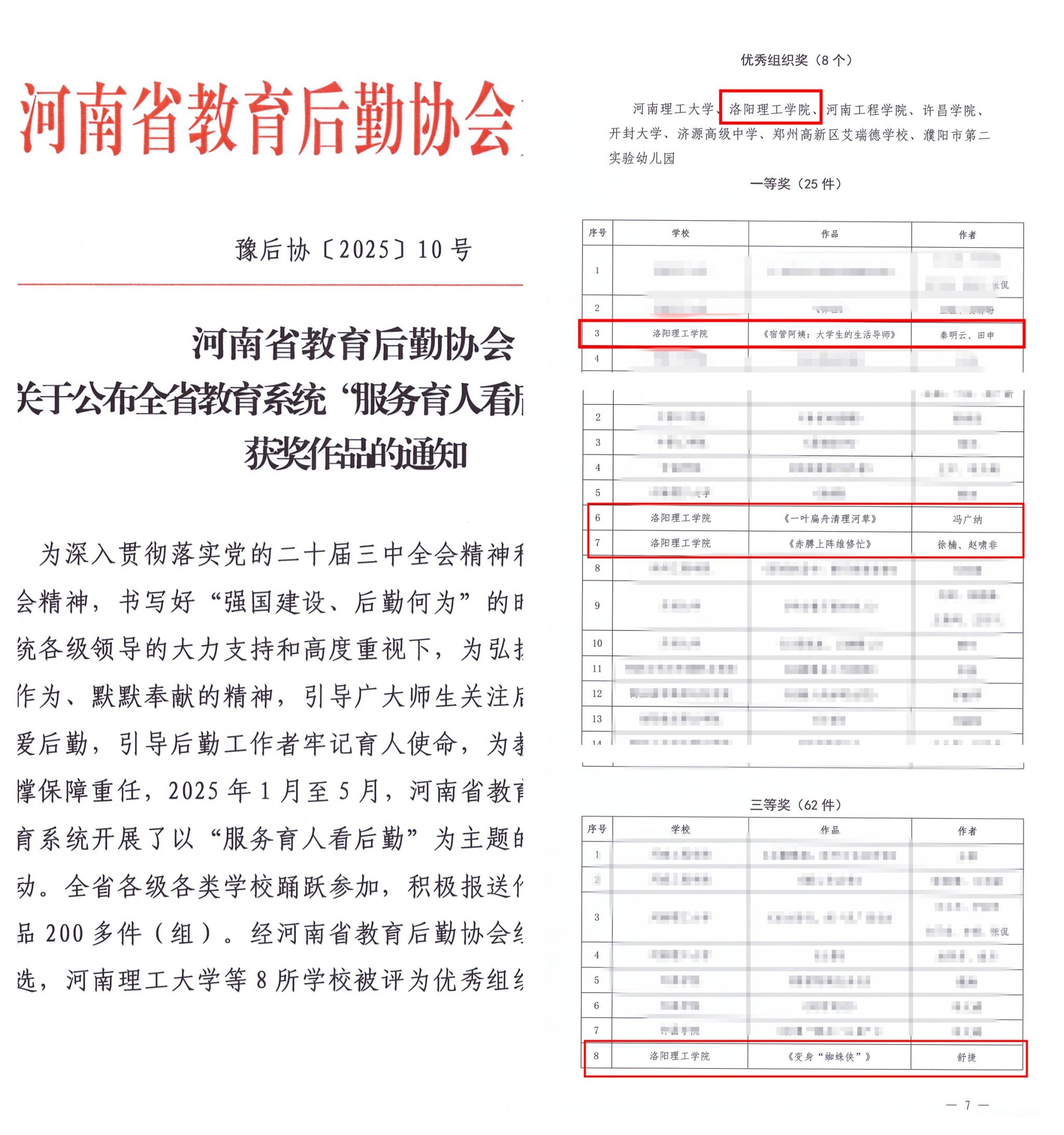 7月2日,河南省教育后勤协会公布了全省教育系统“服务育人看后勤”随手拍获奖结果。在全省众多参赛学校中,我校获评优秀组织奖。在200多件参赛作品中,我处后勤参赛作品《宿管阿姨:大学生的生活导师》荣获一等奖、《一叶扁舟清理河草》、《赤膊上阵维修忙》荣获二等奖,《变身“蜘蛛侠”》荣获三等奖。参赛作品真实反映了后勤保障处职工以师生为中心、默默奉献的一个个生动场景,深刻诠释了后勤职工甘居人后,勤为人先,担当尽责的良好精神风貌。
