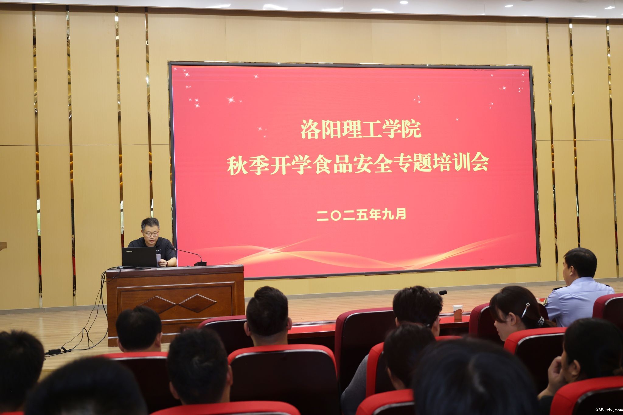 为进一步增强校园食品安全治理能力,确保师生“舌尖上的安全”,9月5日下午,我校组织召开秋季开学食品安全专题培训会。洛龙区市场监督管理局副局长吕瑞涛、餐饮股股长赵晓涛应邀出席培训会,后勤保障处处长王学峰、副处长王磊,饮食服务中心人员、原材料供货商、各餐饮公司负责人和各档口从业人员参加会议。会议由后勤保障处负责人主持。