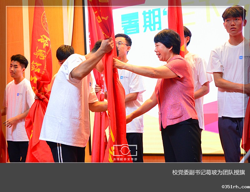 校党委副书记葛玻为重点团队代表授旗,并与在场指导教师和实践团队成员合影留念。2019年暑期“三下乡”社会实践活动正式启动。