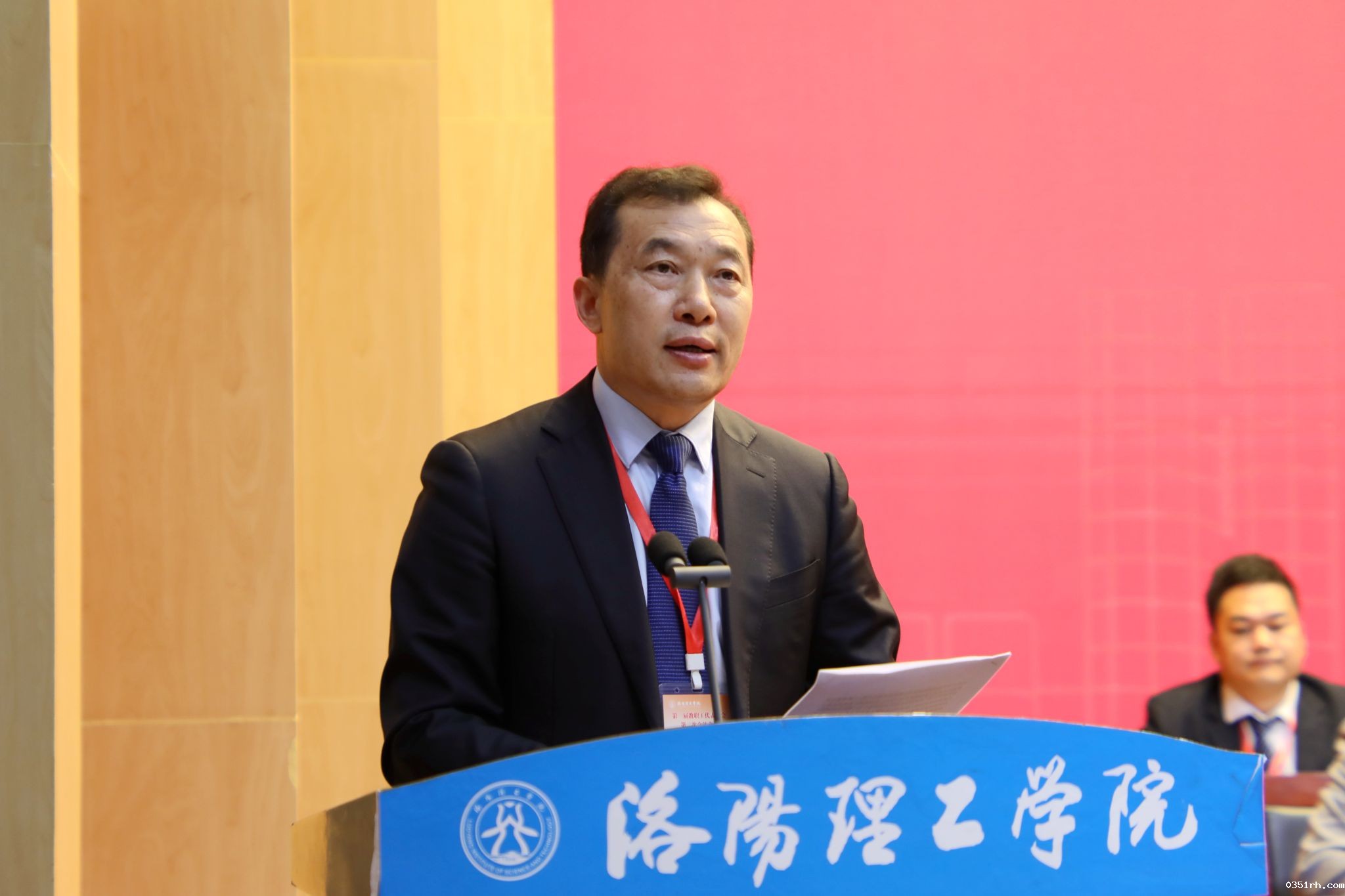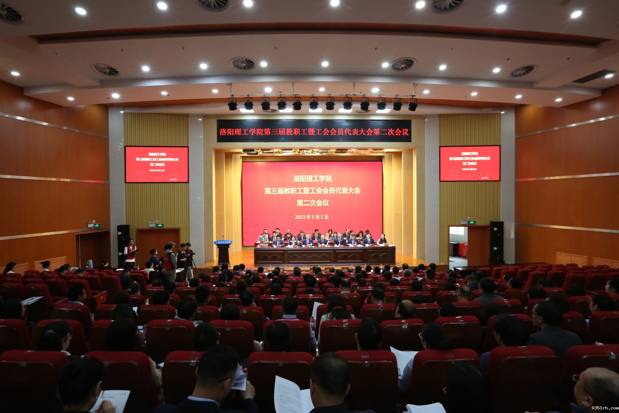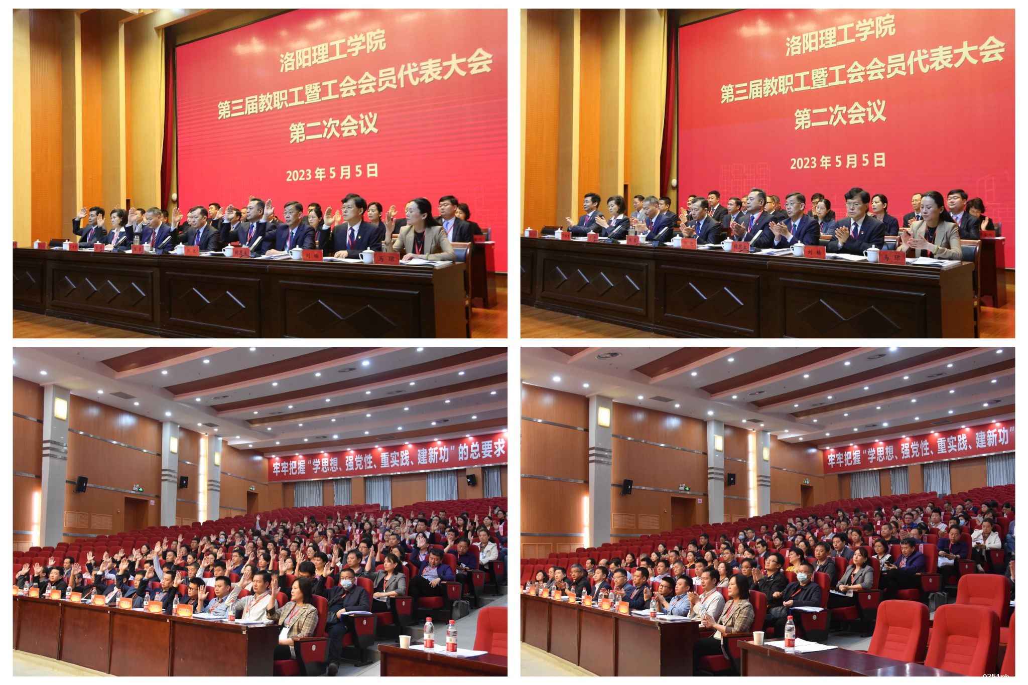 5月5日,BETVLCTOR登录入口第三届教职工暨工会会员代表大会第二次会议在王城校区图书信息中心报告厅胜利召开。校领导陈岩、张锐、曾涛、胡恩立、丁梧秀、刘楠、黄志全、马珺、王新武出席大会,劳模代表作为特邀代表列席会议,158名正式代表和列席代表参加了大会。
