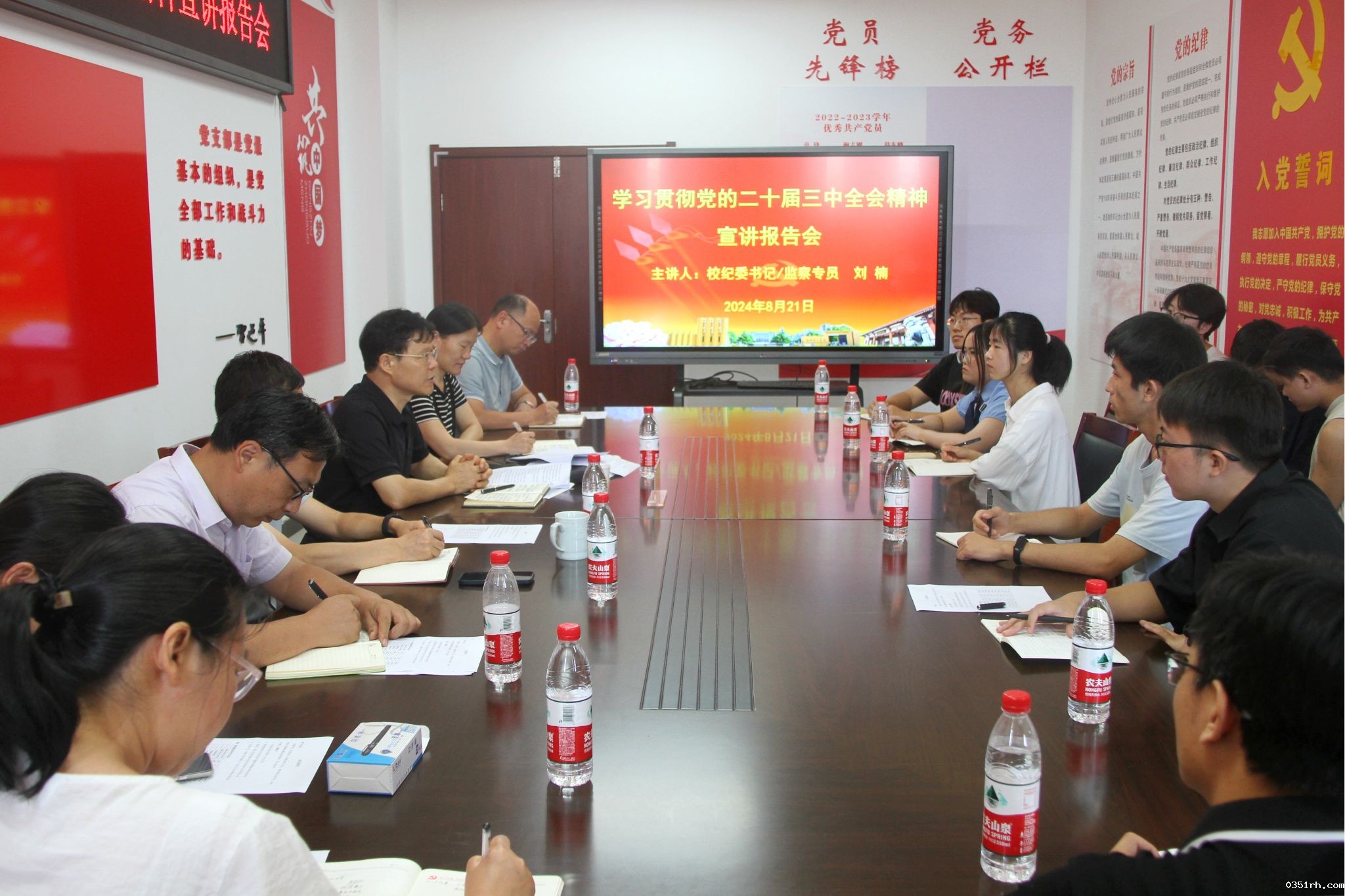 刘楠对党的二十届三中全会精神进行了系统阐释和深入解读。他指出,党的二十届三中全会是在以中国式现代化全面推进强国建设、民族复兴伟业的关键时期召开的一次十分重要的会议,是新征程上改革开放新的里程碑。要从历史意义、理论意义、实践意义等方面深刻认识和把握全会的重大意义。会议审议通过了《中共中央关于进一步全面深化改革、推进中国式现代化的决定》,充分体现了以习近平同志为核心的党中央完善和发展中国特色社会主义制度、推进国家治理体系和治理能力现代化的历史主动,以进一步全面深化改革开辟中国式现代化广阔前景的坚强决心。要深刻领会全会精神,切实把思想和行动统一到党中央决策部署上来,坚定拥护“两个确立”、坚决做到“两个维护”。要原原本本、认认真真学习全会精神,深入领会和把握进一步全面深化改革的主题、重大原则、重大举措、根本保证。要精心组织各党支部的学习贯彻工作,班子成员要先学一步、学深一层、作出表率。要立足部门职责抓好落实,为学校事业高质量发展作出应有的贡献。