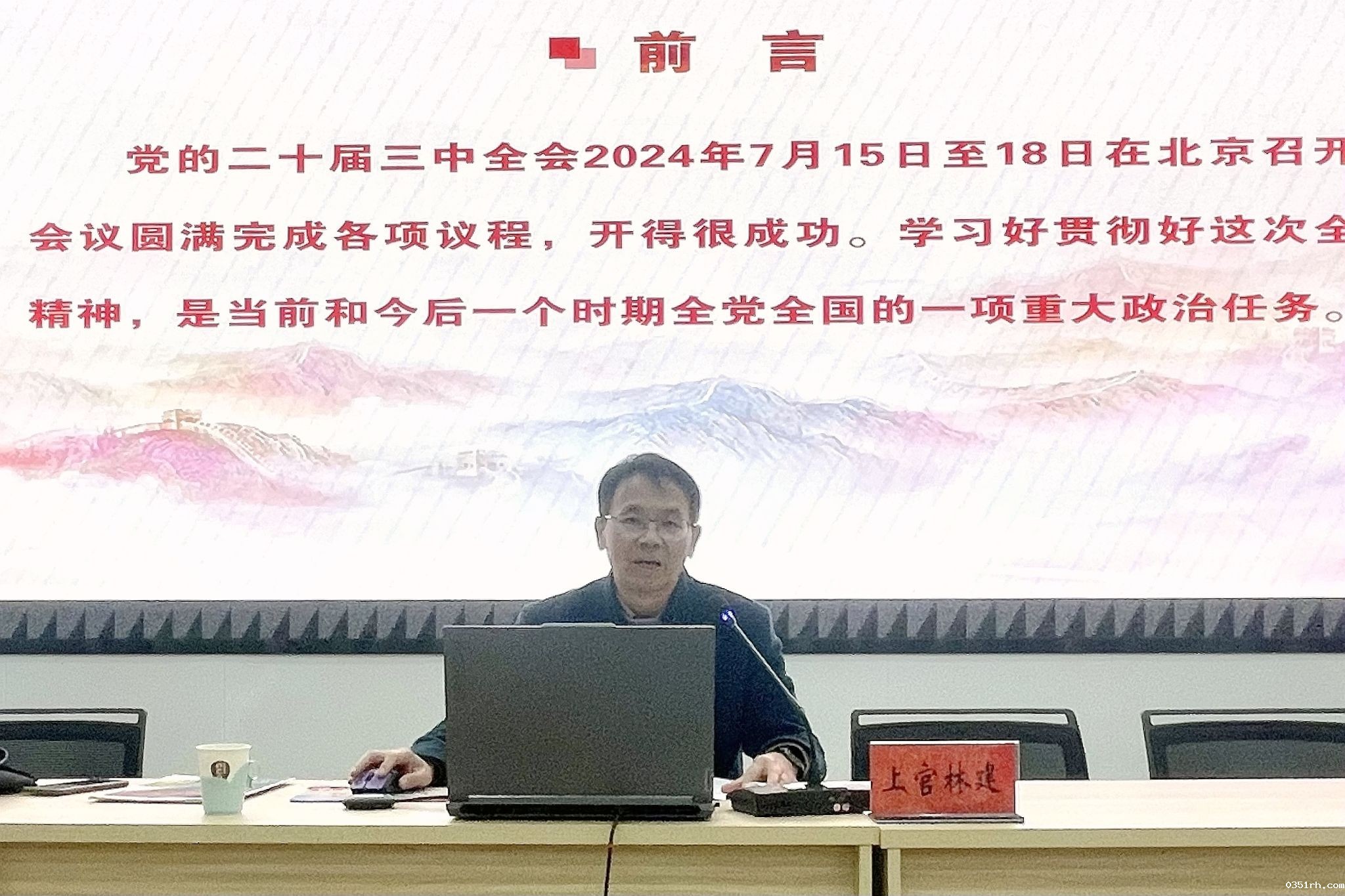 上官林建以《紧紧围绕推进中国式现代化 进一步全面深化改革》为题,从党的二十届三中全会的重要意义、深入学习领会习近平总书记在党的二十届三中全会上的重要讲话精神、全面准确理解《决定》提出的进一步全面深化改革重大举措、全力以赴抓好全会精神贯彻落实等四个方面进行了深入解读,结合学校科研团队建设、课题研发、教学改革等重点工作,要求全体师生持续深入学习贯彻党的二十届三中全会精神,努力创新教学实践、提升人才培养质量,以高质量实现年度目标为学校高质量发展贡献力量。