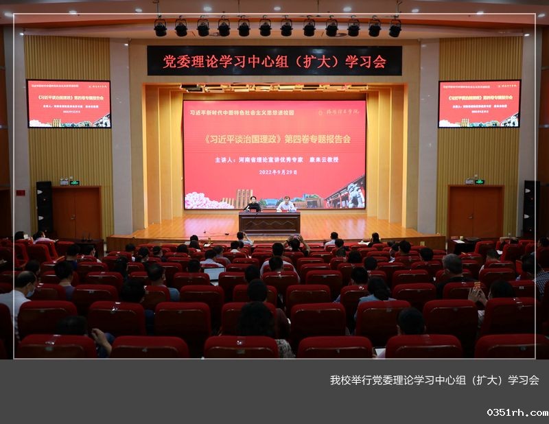 9月29日下午,我校在王城校区图书信息中心报告厅举行党委理论学习中心组(扩大)学习会。会议邀请河南省理论宣讲优秀专家、中共河南省委党校康来云教授就学习《习近平谈治国理政》第四卷作专题报告。在洛校领导、全校中层干部、马克思主义学院全体教师、辅导员代表和党支部书记代表参加会议。会议由校党委书记陈岩主持。