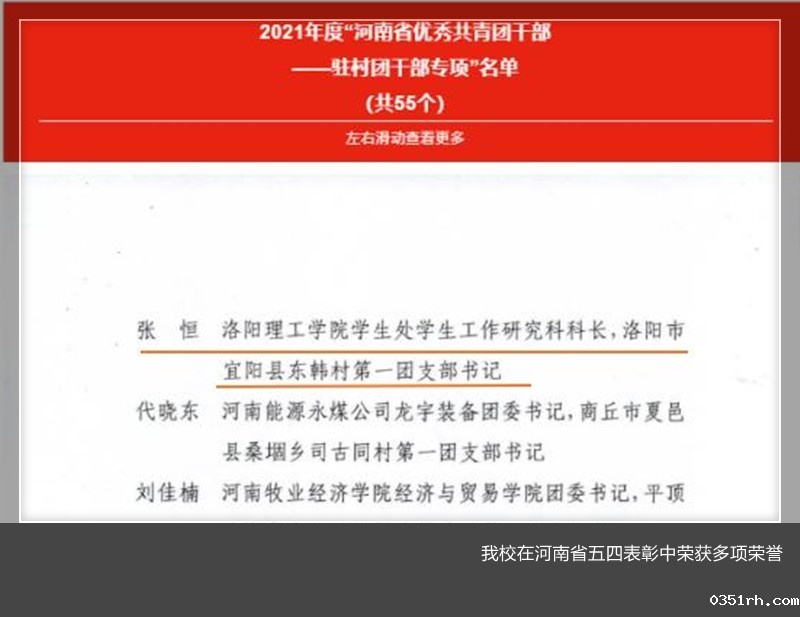 近日,共青团河南省委发文对2021年度“河南省五四红旗团委(团支部)”“河南省优秀共青团员”进行表彰。我校经济与管理学院团委荣获“河南省五四红旗团委(团工委)”,电气工程与自动化学院B190306团支部、会计学院B190806团支部荣获“河南省五四红旗团支部(团总支)”,我校教师张恒荣获“河南省优秀共青团干部-驻村团干部专项”,土木工程学院B190506班大学生董康、环境工程与化学学院B200606班大学生李静宜荣获“河南省优秀共青团员”。