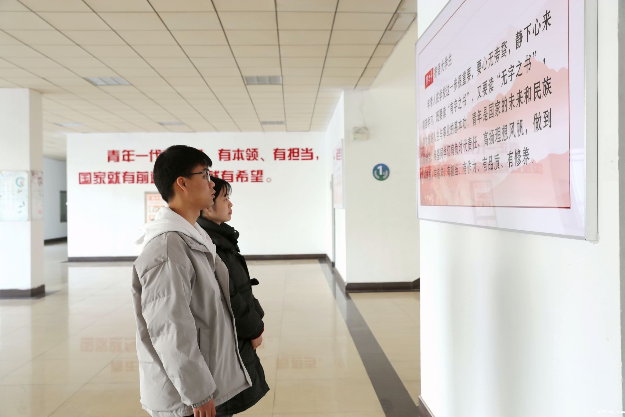 全新的宣传展板图文并茂,涵盖了习近平总书记关于教育的重要论述、关于青年大学生的寄语等内容。以润物细无声的形式,将思想政治工作与楼宇文化建设有机结合,引导广大教师坚守育人初心,争做新时代“四有”好老师;鼓励青年学生要不负时代、不负韶华,在青春的赛道上奋力奔跑,争做有理想、敢担当、能吃苦、肯奋斗的新时代好青年。