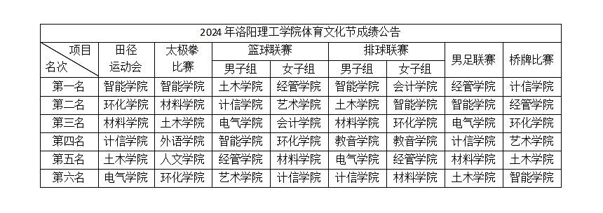 经过两个多月的激烈角逐,最终智能制造学院荣获学生太极拳比赛、田径运动会和排球联赛男子组三项冠军,经济与管理学院荣获男足联赛和篮球联赛女子组两项冠军,土木工程学院荣获篮球联赛男子组冠军,会计学院荣获排球联赛女子组冠军,计算机与信息工程学院荣获桥牌比赛团体冠军。