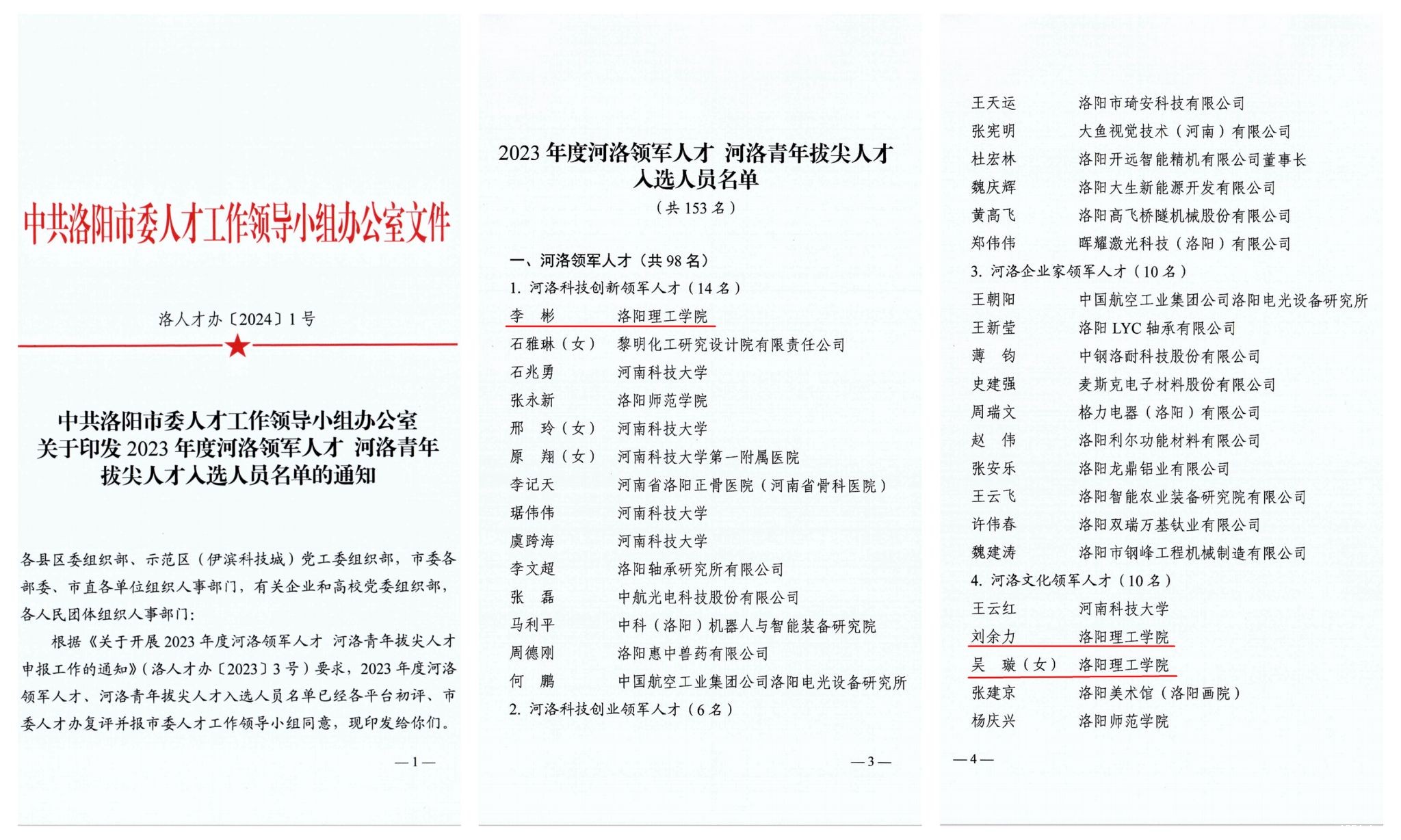 近日,中共洛阳市委人才工作领导小组办公室公布了2023年度河洛领军人才、河洛青年拔尖人才入选人员名单,我校多名教师入围。
