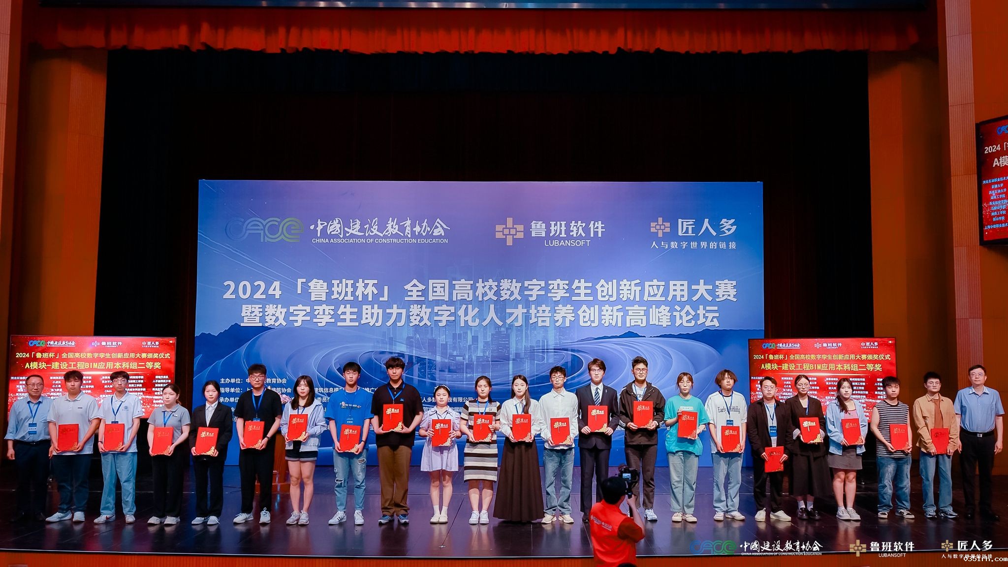 我校学生团队(左八)在“鲁班杯”全国高校数字孪生创新应用大赛中荣获一等奖,图为颁奖现场。