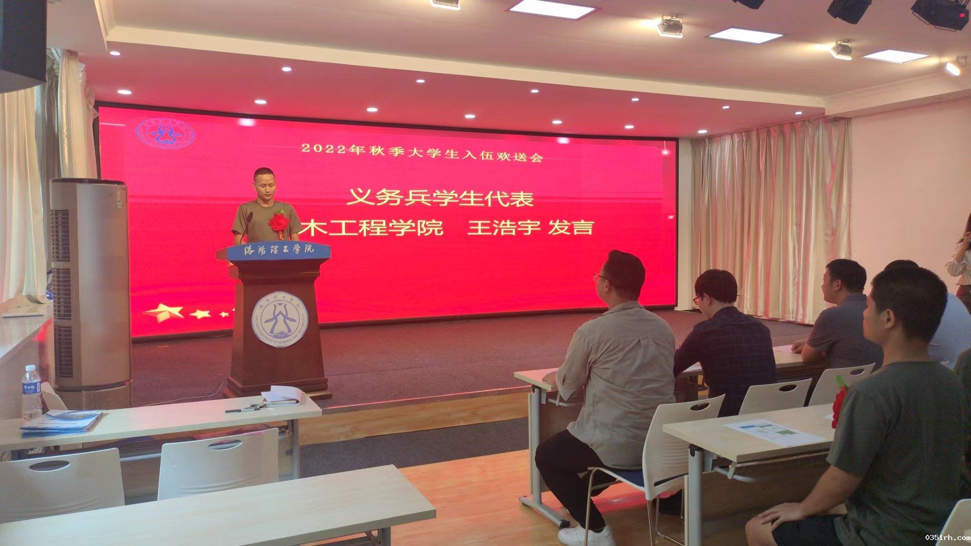 欢送会上,校武装部负责人宣读了2022年秋季入伍学生名单。土木工程学院学生王浩宇,计算机与信息工程学院学生郝硕代表全体入伍新兵依次发言,表达了自己建功军营的决心。人文与社会科学学院靳景代表辅导员为入伍学生送上祝福,希望能够把握机会,锤炼身体素质,磨砺精神意志,在军营挥洒青春热血,用行动助力国防现代化建设,彰显当代大学生的精神风貌,做一名合格的大学生士兵。
