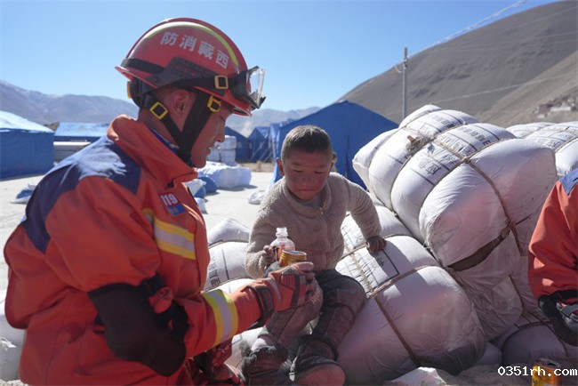 2025年1月8日,在西藏定日县措果乡塘仁村安置点,消防救援人员和小朋友互动。1月7日,西藏日喀则市定日县发生6.8级地震。新华社记者 晋美多吉 摄